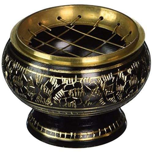 India Small Decorated Brass Charcoal Screen Incense Burner with WoodenCoaster