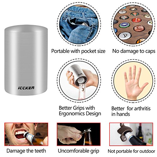 ?ICCKER New Version fantastic pocket manual good grips bottle opener inspired by beer buffs would impress you easily by professional grade durable 403 stainless steel body,elegant classical appearance,magnetic absorption design and powerful decaping ability