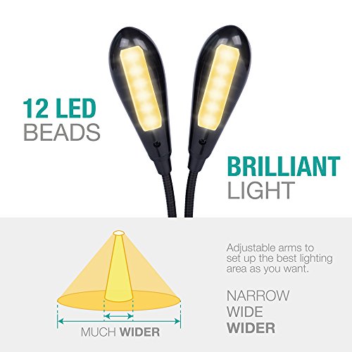 LATEST SMD LED TECHNOLOGY- Most suitable LED for eyes reading lights. Light up 3x broader area evenly than normal LED. Flicker-free and glare-free, 100000 hours life. 12 LEDs are the max number for such a compact clip on reading light, much broader and brighter than other 4 or 8 LEDs book lights. Dual independent heads light up 2 full pages of your any size books, novels, orchestra, A4 size magazines, and larger pages.