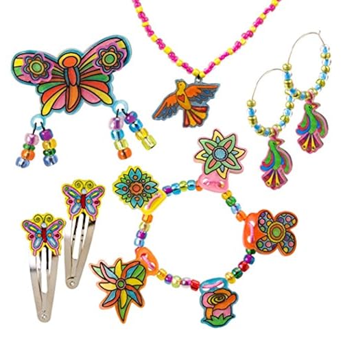 Includes over forty pre-cut shapes, eight colored pencils, beads, earring hoops, barrettes, string, clasps, adhesive dots and instructions