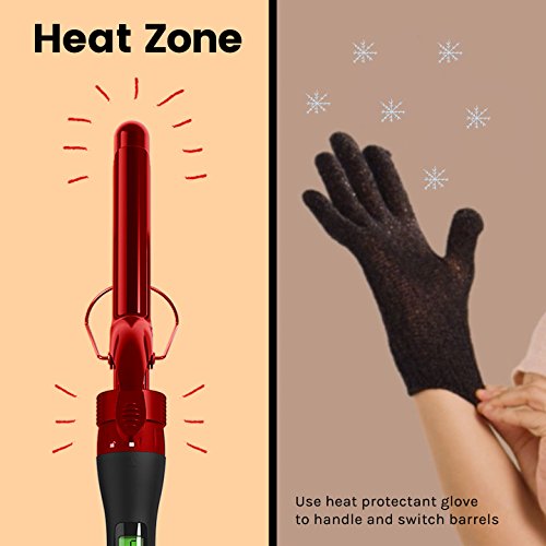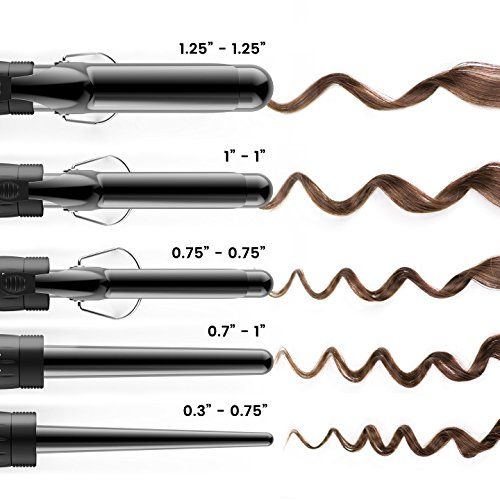 HAIR CURLING WAND PACK - Designed to maximum surface area, these barrels do not have a cool tip, so youre able to style every strand of hair. This curling wand set includes 5 detachable barrels: 1x 0.3 - 0.75 inch tapered clipless barrel, 1x 0.7 - 1 inch tapered clipless barrel, 1x 0.7 - 1 inch barrel with clamp, 1x 1 inch barrel with clamp, 1x 1.25 inch barrel with clamp plus a heat Resistant glove. Use large wand curling iron barrels for long hair and thinner for short hair for best results