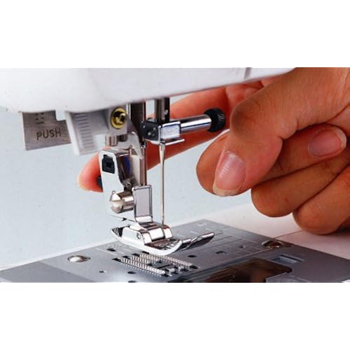 Features needle threader, thread cutter, drop-in bobbin loading, and auto bobbin winding; 1-step auto-size buttonholer