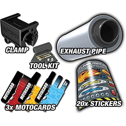 Each set includes the megaphone Exhaust pipe, 3 Motocards, 15 custom stickers, universal fitting clamp and all the tools youll need; for ages 6+