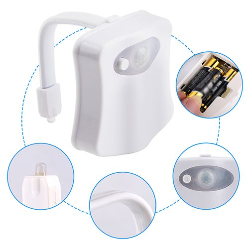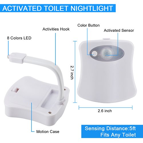 > The toilet bowl light is easy to set and instal,portable size: 2.6 x 2.7 x 0.2 inches,energy saving: 3*AAA battery for half a year,waterproof and ea