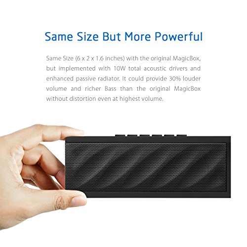 Same Size (6 x 2 x 1.6 inches) with the original MagicBox, but implemented with 10W total acoustic drivers and enhanced passive radiator. It could provide 30% louder volume and richer Bass than the original MagicBox.